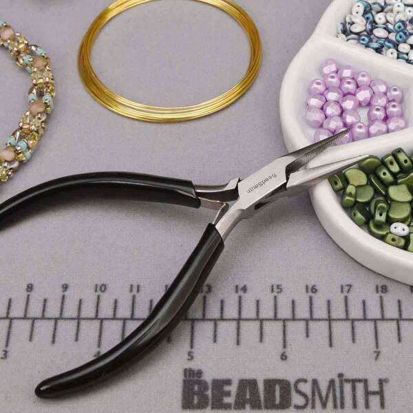 This plier is from the Slim-Line series brought to you by The Beadsmith. It is 4.5 inches long (115mm) and has a black PVC handle, with a very comfortable grip. It is made of a box joint construction, with tapered tips, serrated jaws, and slightly rounded edges allowing you to accurately crimp, shape, and bend. The double-left spring helps reduce hand fatigue. These pliers have extra-fine tips for close up, precision applications. The break strength is Rockwell Hardness 42 – 45. Chain nose pliers are a very versatile tool, most commonly used for gripping and manipulating wire, head pins and eye pins, as well as opening and closing jump rings and earring wires. The jaws of chain nose pliers are shorter, making them easier to work with – and the surface on the inside of the jaws is serrated. They are ideal for making jewelry and metalwork, such as chainmaille. These are great for jewelry making, as well as other arts and crafts projects. Whether you are a beginner or making a living with your jewelry designs, we know you will find this tool absolutely essential.