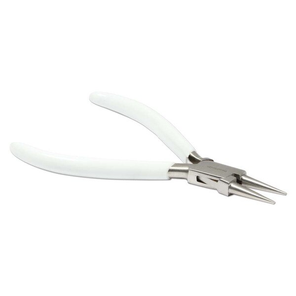 This plier is from the 300 series brought to you by The Beadsmith. It is 5 inches long (130mm) and has a white PVC handle, with a very comfortable grip. The box-joint construction is reliable and great for smooth operation while the double-leaf spring helps reduce hand fatigue. These pliers are made for doing heavier work. This is a professional jeweler’s tool made with the same quality as European pliers. The break strength is Rockwell Hardness 42 – 45. Round nose pliers are essential for creating consistent, well-shaped bends and loops. The jaws are solid steel that are thickest at the base and taper to be thinner at the tip. Depending where you put your wire on the jaw will decide the size of your loops. The surface on the inside of the jaws is completely smooth, not serrated. This is extremely important, to avoid marring and scratching your wire as you work with it. These are great for jewelry making, as well as other arts and crafts projects. Whether you are a beginner or making a living with your jewelry designs, we know you will find this tool absolutely essential.