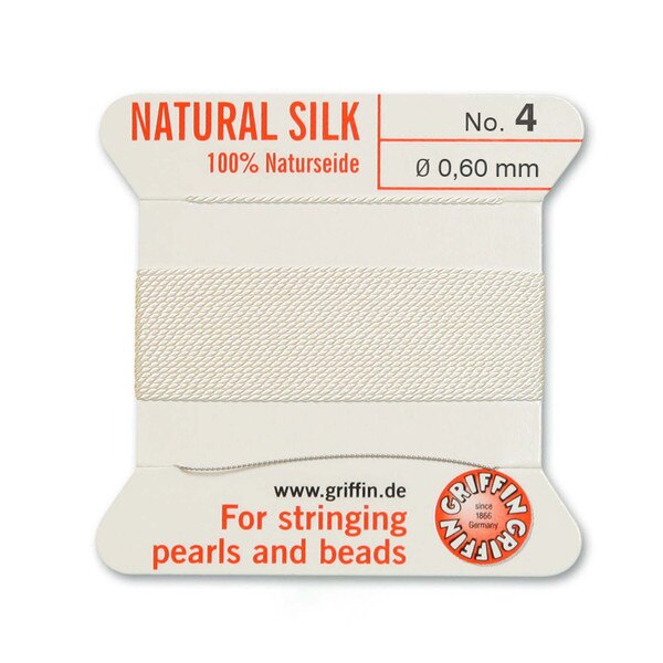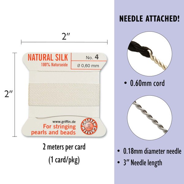 When you want to create delicate and luxurious necklaces or bracelets, Griffin silk cord is perfect for knotting beads, pearls, or gemstones. The thread is plied from 100% pure silk and is made from twisted 3-ply cords. The material is luxurious, soft, and supple. However, the fine thread is extremely durable and stretch-resistant, making it perfect for knotting pearls, gemstones, and beads in your craft and beading projects. This silk cord is pre-threaded on a flexible stainless-steel needle, so you are ready to start any project immediately. This passes through most beads, pearls, and adornments for your crafting projects. This cord is easy to tie as well, and the knots remain virtually invisible. With this string, you can create durable pieces of high-quality jewelry. With this silk cord, your homemade jewelry and crafts will retain a professional look for years to come. String and knot the thread to craft unique jewelry creations or to repair existing pieces. Griffin silk cord is a great option to re-string or repair your existing jewelry. Unlock your creativity and manipulate this fine thread to make jewelry pieces for your own collection or to add to someone else's jewelry accessories. This versatile thread is great for beginners and advanced jewelry makers alike. Show someone how much you care by making a personalized statement pearl necklace or bracelet. Handmade beaded or pearl jewelry pieces make great gifts for friends or loved ones for Christmas, graduations, birthdays, weddings, or other special occasions. Add this jewelry string to your crafting supplies today and unlock your artistic talents.