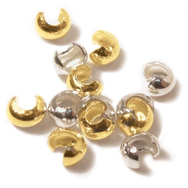 Crimp beads are small, cylindrical beads used in jewelry making to secure beading wire or thread in place. They work by being placed onto the wire or thread and then compressed using crimping pliers, which flatten the bead and pinch it tightly against the wire. This creates a secure hold that prevents beads from sliding or shifting, making crimp beads essential for creating professional-looking, durable jewelry designs. Crimp beads come in various sizes and finishes, allowing for versatility in both function and style. They are often used in combination with crimp covers to create a polished and finished look.