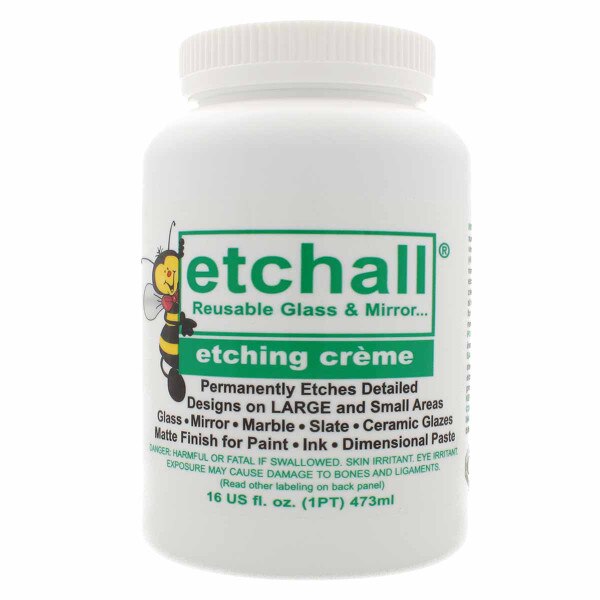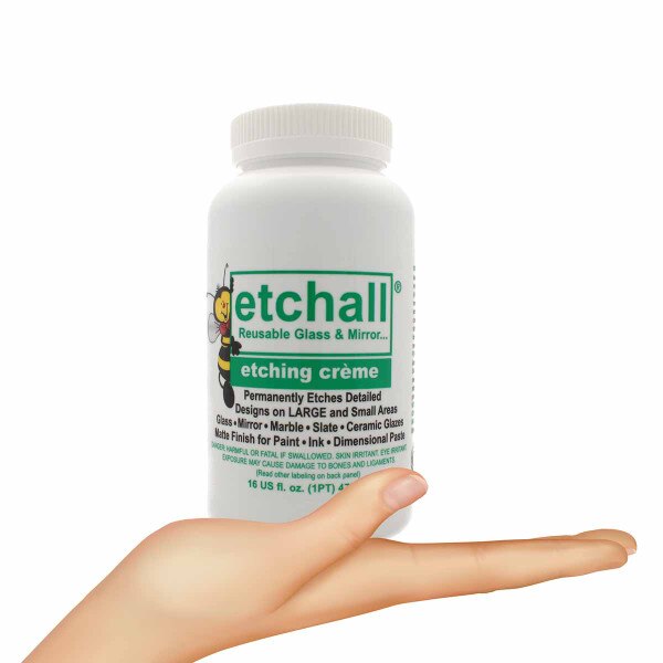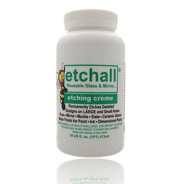 Transform your glass, mirror, ceramic, porcelain, marble, and slate surfaces with the versatile and re-usable Etchall etching crème. This powerful crème produces a white opaque permanent etched finish, perfect for creating intricate designs. Its thick consistency makes it ideal for use with Etchmask vinyl stencils, allowing you to etch even on rounded and vertical surfaces. Imagine the possibilities—Etchall can even be used on your doors and windows for stunning, custom designs! Approved by the Art and Craft Material Institute, Etchall etching crème is safe for use by children 12 years and older. Younger children can also enjoy the creative process under parental supervision, adhering to ASTM-D4236 standards. Available in convenient 4oz., 16oz., and 32oz. sizes, Etchall etching crème offers the flexibility to handle projects of any scale. Unleash your creativity and add a touch of elegance to your home decor with Etchall etching crème, the perfect tool for both novice and experienced crafters. To begin etching, gather your supplies: etchall® etching crème, a squeegee, a detail pick knife, your surface, and a 3-part stencil. Prepare your work area by covering it and cleaning the surface with water or alcohol. Apply the stencil carefully, ensuring it's smooth and aligned. Use the pick knife to remove the stencil's sections, avoiding distortion. Apply the crème evenly with the squeegee, ensuring all non-etched areas are covered. After 15 minutes, rinse off the crème with hot water. Remember to keep crème away from porcelain sinks or ceramic tiles. Once rinsed, remove the stencil and wash your newly etched surface.