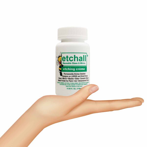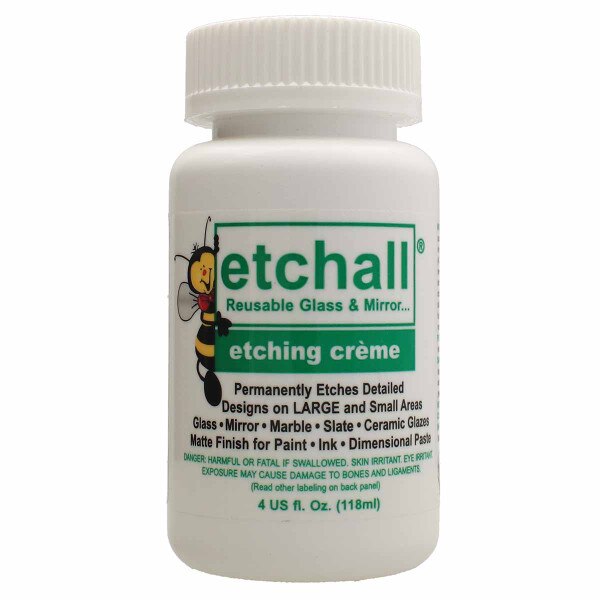 Transform your glass, mirror, ceramic, porcelain, marble, and slate surfaces with the versatile and re-usable Etchall etching crème. This powerful crème produces a white opaque permanent etched finish, perfect for creating intricate designs. Its thick consistency makes it ideal for use with Etchmask vinyl stencils, allowing you to etch even on rounded and vertical surfaces. Imagine the possibilities—Etchall can even be used on your doors and windows for stunning, custom designs! Approved by the Art and Craft Material Institute, Etchall etching crème is safe for use by children 12 years and older. Younger children can also enjoy the creative process under parental supervision, adhering to ASTM-D4236 standards. Available in convenient 4oz., 16oz., and 32oz. sizes, Etchall etching crème offers the flexibility to handle projects of any scale. Unleash your creativity and add a touch of elegance to your home decor with Etchall etching crème, the perfect tool for both novice and experienced crafters. To begin etching, gather your supplies: etchall® etching crème, a squeegee, a detail pick knife, your surface, and a 3-part stencil. Prepare your work area by covering it and cleaning the surface with water or alcohol. Apply the stencil carefully, ensuring it's smooth and aligned. Use the pick knife to remove the stencil's sections, avoiding distortion. Apply the crème evenly with the squeegee, ensuring all non-etched areas are covered. After 15 minutes, rinse off the crème with hot water. Remember to keep crème away from porcelain sinks or ceramic tiles. Once rinsed, remove the stencil and wash your newly etched surface.
