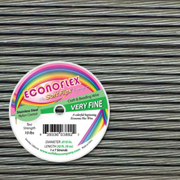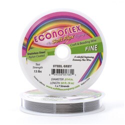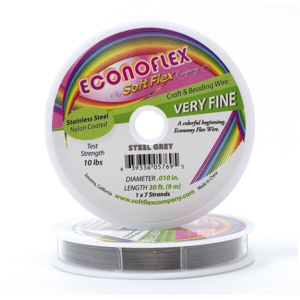 Econoflex Wire is a colorful beginning at an affordable price. Econoflex Wire is a lead-free beading Wire for beginners, crafters and price conscious hobbyists. Econoflex Wire is 7 strands of woven stainless steel Wire, coated in nylon. It is available in 7 designer colors in addition to Steel Grey. It is available in 3 diameters: .010, .014, and .019. We recommend Econoflex Wire for beaded lampshades, beaded curtains and craft jewelry. Please Note: This is a sturdy, functional beading Wire, but it does not offer the full flexibility, draping quality & kink resistance of the more expensive Soft Flex or Soft Touch lines. Basic Usage: .010 Very Fine - Ideal for embellishing, weaving, crocheting and stringing very small beads. We suggest finishing 1x1mm crimps. .014 Fine - Ideal for soft materials, seed beads and fresh water pearls. We suggest finishing 2x2mm crimps. .019 Medium - Ideal all purpose Wire. Great glass, mineral, and metal beads. We suggest finishing 2x2mm crimps.