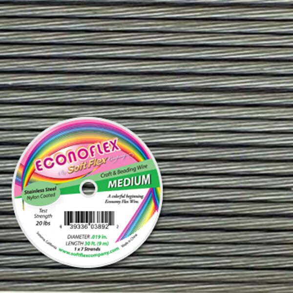 Econoflex Wire is a colorful beginning at an affordable price. Econoflex Wire is a lead-free beading Wire for beginners, crafters and price conscious hobbyists. Econoflex Wire is 7 strands of woven stainless steel Wire, coated in nylon. It is available in 7 designer colors in addition to Steel Grey. It is available in 3 diameters: .010, .014, and .019. We recommend Econoflex Wire for beaded lampshades, beaded curtains and craft jewelry. Please Note: This is a sturdy, functional beading Wire, but it does not offer the full flexibility, draping quality & kink resistance of the more expensive Soft Flex or Soft Touch lines. Basic Usage: .010 Very Fine - Ideal for embellishing, weaving, crocheting and stringing very small beads. We suggest finishing 1x1mm crimps. .014 Fine - Ideal for soft materials, seed beads and fresh water pearls. We suggest finishing 2x2mm crimps. .019 Medium - Ideal all purpose Wire. Great glass, mineral, and metal beads. We suggest finishing 2x2mm crimps.