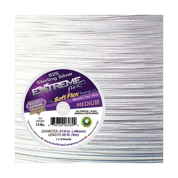 Soft Flex Extreme Wire is the world's first eco-friendly beading Wire. Soft Flex Extreme Wire is a beading Wire, free of heavy metals, for designers that want to add sparkle and shine to a piece that exposes the Wire. Soft Flex Extreme Wire will not tarnish and is great for free floating necklaces and pendants. Soft Flex Extreme Wire is constructed of 1x19 micro woven metal alloy Wires. It is supple enough that it can be knotted and comes in 3 radiant colors. It is available in 3 diameters: .014, .019, and .024. We recommend Soft Flex Extreme Wire for designers that want to be 'green' and desire a high quality Wire for high end jewelry. Basic Usage: .010 Very Fine - Ideal for embellishing, weaving, crocheting and stringing very small beads. We suggest finishing 1x1mm crimps. .014 Fine - Ideal for soft materials, seed beads and fresh water pearls. We suggest finishing 2x2mm crimps. .019 Medium - Ideal all purpose Wire. Great glass, mineral, and metal beads. We suggest finishing 2x2mm crimps. .024 Heavy - Ideal for abrasive materials, large stones, lamp work and bracelets. We suggest finishing 2x3mm crimps.