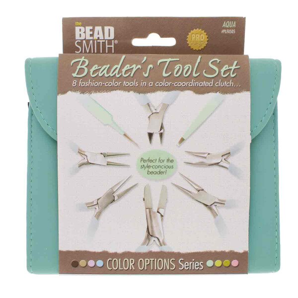 Designed to make jewelry repair, improvement, and creation easier, the Beadsmith Fashion Color Plier Set and Clutch is an excellent addition to any jewelry making or jewelry repair supplies. Made from high-quality materials, these tools are durable, heavy duty, and built to last. Get 8 colorful pieces plus a matching leather carrying case. The kit includes chain-nose pliers, bent chain-nose pliers, flat-nose pliers, nylon jaw flat-nose pliers, round-nose pliers, side-cutter pliers, knotting tweezers, and split-ring tweezers. Our pliers feature comfortable handles to improve your grip and boast heavy-duty double-leaf springs to reduce strain on your hands. Plus, they are made with a box-joint construction, ensuring durability and longevity. Whether you're a professional jewelry artist or a hobby crafter, this plier tool kit makes a great addition to your art and craft supplies. It is designed to assist in beading and intricate jewelry pieces — even chainmail and bailing. Because this set is so versatile, it makes a great gift for Christmas, a birthday, or any special occasion. Help your friends, family, and loved ones develop their creative and artistic talents with this complete kit. It makes it easy to create beautiful pieces of jewelry! No matter what kind of wire you're using, these tools are durable and built to last. Making DIY jewelry and fashion accessories has never been easier! You can bend, wrap, straighten, or loop wires in no time. Choose from 8 fun colors: Light Blue, Chocolate, Orchid, Aqua, Light Olive, Desert Beige, Olive, and Bubble Gum. Your hobby should be fun and simple. Don't settle for old tools that break easily — this set of pliers is heavy duty, convenient, and easy to use for crafting jewelry.