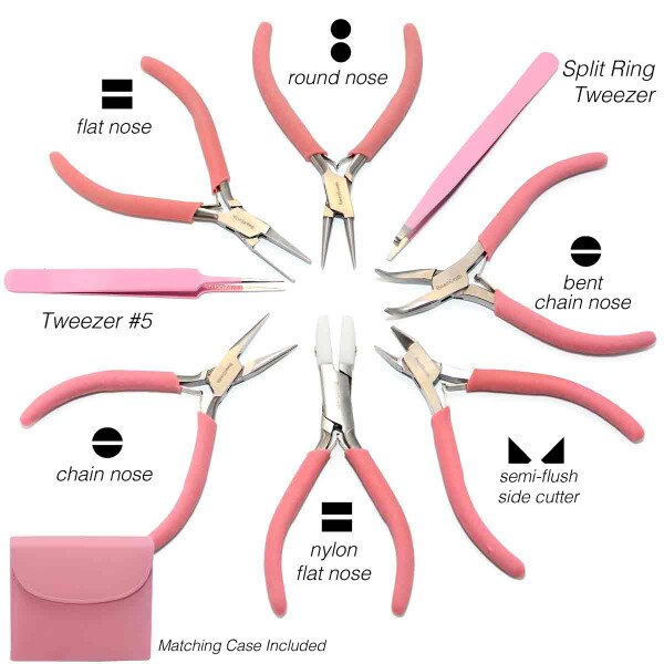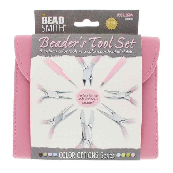 Designed to make jewelry repair, improvement, and creation easier, the Beadsmith Fashion Color Plier Set and Clutch is an excellent addition to any jewelry making or jewelry repair supplies. Made from high-quality materials, these tools are durable, heavy duty, and built to last. Get 8 colorful pieces plus a matching leather carrying case. The kit includes chain-nose pliers, bent chain-nose pliers, flat-nose pliers, nylon jaw flat-nose pliers, round-nose pliers, side-cutter pliers, knotting tweezers, and split-ring tweezers. Our pliers feature comfortable handles to improve your grip and boast heavy-duty double-leaf springs to reduce strain on your hands. Plus, they are made with a box-joint construction, ensuring durability and longevity. Whether you're a professional jewelry artist or a hobby crafter, this plier tool kit makes a great addition to your art and craft supplies. It is designed to assist in beading and intricate jewelry pieces — even chainmail and bailing. Because this set is so versatile, it makes a great gift for Christmas, a birthday, or any special occasion. Help your friends, family, and loved ones develop their creative and artistic talents with this complete kit. It makes it easy to create beautiful pieces of jewelry! No matter what kind of wire you're using, these tools are durable and built to last. Making DIY jewelry and fashion accessories has never been easier! You can bend, wrap, straighten, or loop wires in no time. Choose from 8 fun colors: Light Blue, Chocolate, Orchid, Aqua, Light Olive, Desert Beige, Olive, and Bubble Gum. Your hobby should be fun and simple. Don't settle for old tools that break easily — this set of pliers is heavy duty, convenient, and easy to use for crafting jewelry.