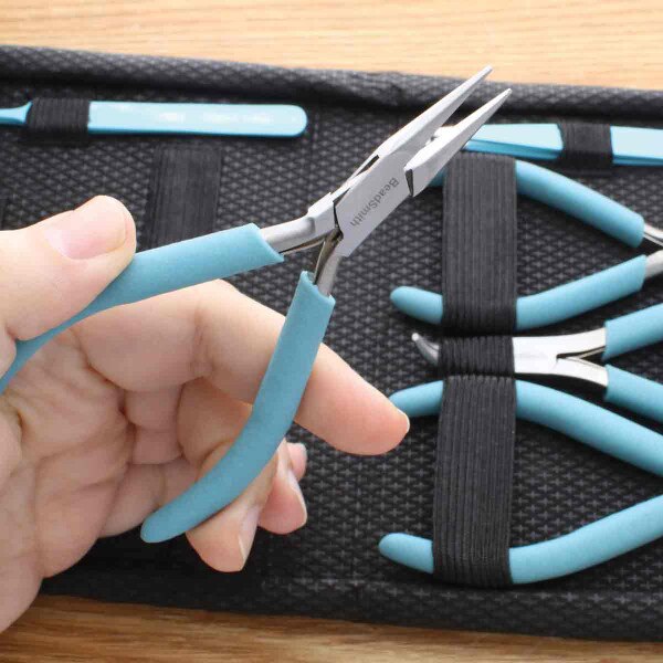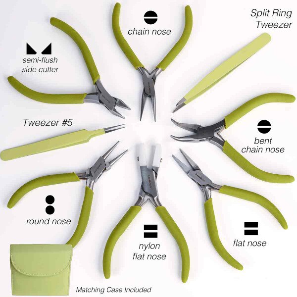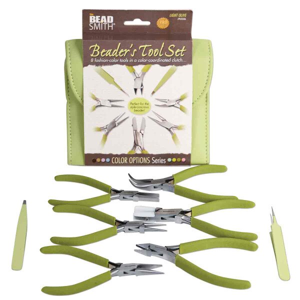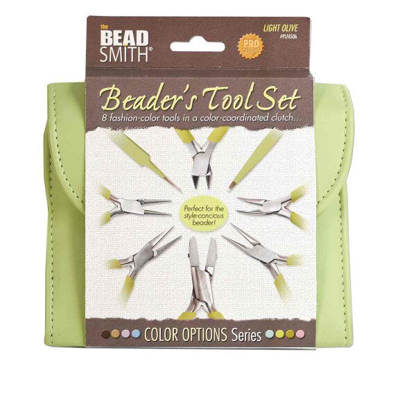 Designed to make jewelry repair, improvement, and creation easier, the Beadsmith Fashion Color Plier Set and Clutch is an excellent addition to any jewelry making or jewelry repair supplies. Made from high-quality materials, these tools are durable, heavy duty, and built to last. Get 8 colorful pieces plus a matching leather carrying case. The kit includes chain-nose pliers, bent chain-nose pliers, flat-nose pliers, nylon jaw flat-nose pliers, round-nose pliers, side-cutter pliers, knotting tweezers, and split-ring tweezers. Our pliers feature comfortable handles to improve your grip and boast heavy-duty double-leaf springs to reduce strain on your hands. Plus, they are made with a box-joint construction, ensuring durability and longevity. Whether you're a professional jewelry artist or a hobby crafter, this plier tool kit makes a great addition to your art and craft supplies. It is designed to assist in beading and intricate jewelry pieces — even chainmail and bailing. Because this set is so versatile, it makes a great gift for Christmas, a birthday, or any special occasion. Help your friends, family, and loved ones develop their creative and artistic talents with this complete kit. It makes it easy to create beautiful pieces of jewelry! No matter what kind of wire you're using, these tools are durable and built to last. Making DIY jewelry and fashion accessories has never been easier! You can bend, wrap, straighten, or loop wires in no time. Choose from 8 fun colors: Light Blue, Chocolate, Orchid, Aqua, Light Olive, Desert Beige, Olive, and Bubble Gum. Your hobby should be fun and simple. Don't settle for old tools that break easily — this set of pliers is heavy duty, convenient, and easy to use for crafting jewelry.