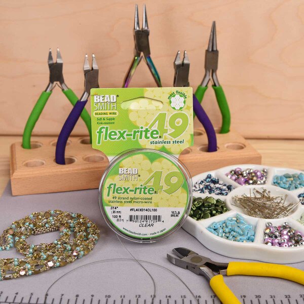 Superior strength and extreme flexibility join together using state-of-the-art micro wire technology to create Flex-rite. This beading wire is made of stainless-steel wires that are coated in nylon, making the texture smooth and soft. In addition, it is kink resistant, abrasion resistant and very supple. Flex-rite is designed to provide an excellent drape, making it a very wearable material. Designers find this ideal for creating bracelets, necklaces, and other jewelry accessories. Because of its functionality, this bendable, micro-fused thread is great for beginners and advance jewelry makers. It’s a very popular choice for both small and heavier beads, for creating larger statement pieces, as well as simple, modern jewelry. Wire projects can be finished with crimp beads, crimp tubes or clamshells for a flawless finish. Flex-rite comes in a selection of metallic and vibrant colors, as well as 4 sizes to accommodate a variety of projects. The 7 strand is a good quality for general purpose use. The 19 and 21 strands provide a better flexibility and softness, while the 49 strand is a professional quality, that offers long lasting superior strength. Crafters and other hobbyists use these to make sun catchers, hanging crystals, minimalist wreaths and windchimes. Bring out your creativity and show off a beautiful esthetic with unique and thoughtfully crafted art.