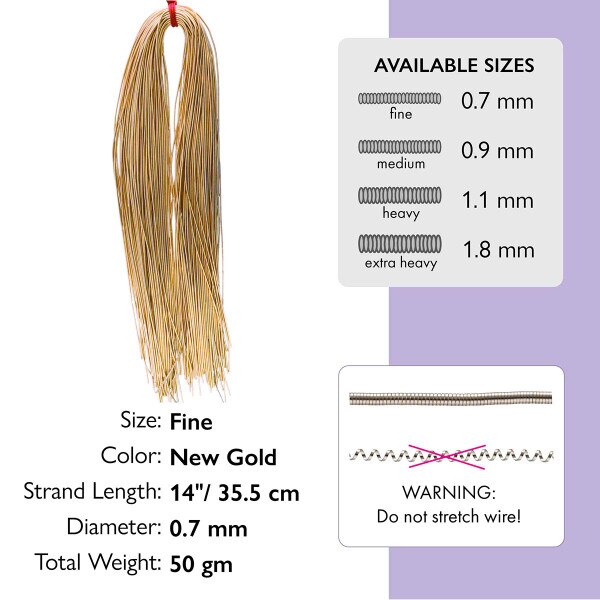 Discover the elegance of French wire, also known as bullion or gimp, a delicate spiral crafted from silver or gold-filled wire. Jewelers employ this ingenious tool to artfully conceal beading wire near crimps and clasps, ensuring a seamless finish. Experience a refined touch with French wire, adding sophistication to your jewelry. Not only does it beautify your pieces, but it also fortifies, and safeguards beadwork ends. This choice is a favorite among hobbyist beaders, particularly in projects involving seed beads and knotted pearls. Unveil the artistry of a coiled tunnel as wire is meticulously spun into a compact coil. There are several size options to choose from – fine, medium, heavy and extra heavy, as well as two lengths – a larger 50-gram package, or smaller use 14- and 16-inch pieces. The wire comes in a variety of colors – gold, new gold, silver, copper, grey, champagne and vintage bronze, each guaranteed to add that elegant finish to your jewelry. Simplicity meets ingenuity with French wire. Secure the crimp and select the appropriate piece of wire. Slide it deftly through the needle, then weave the clasp in tandem with the French wire through the crimp, adroitly concealing the cord. A pair of crimping pliers assists in crafting a neat crease with parallel sides, a technique easily repeated on the opposite end. Elevate your jewelry-making journey with this user-friendly process, expertly enhancing your creations.