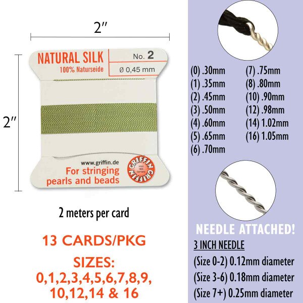 When you want to create delicate and luxurious necklaces or bracelets, Griffin silk cord is perfect for knotting beads, pearls, or gemstones. The thread is plied from 100% pure silk and is made from twisted 3-ply cords. The material is luxurious, soft, and supple. However, the fine thread is extremely durable and stretch-resistant, making it perfect for knotting pearls, gemstones, and beads in your craft and beading projects. This silk cord is pre-threaded on a flexible stainless-steel needle, so you are ready to start any project immediately. This passes through most beads, pearls, and adornments for your crafting projects. This cord is easy to tie as well, and the knots remain virtually invisible. With this string, you can create durable pieces of high-quality jewelry. With this silk cord, your homemade jewelry and crafts will retain a professional look for years to come. String and knot the thread to craft unique jewelry creations or to repair existing pieces. Griffin silk cord is a great option to re-string or repair your existing jewelry. Unlock your creativity and manipulate this fine thread to make jewelry pieces for your own collection or to add to someone else's jewelry accessories. This versatile thread is great for beginners and advanced jewelry makers alike. Show someone how much you care by making a personalized statement pearl necklace or bracelet. Handmade beaded or pearl jewelry pieces make great gifts for friends or loved ones for Christmas, graduations, birthdays, weddings, or other special occasions. Add this jewelry string to your crafting supplies today and unlock your artistic talents.