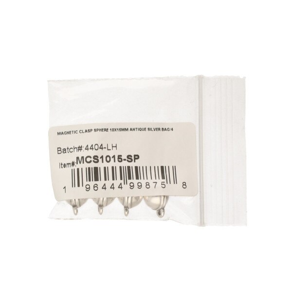 MAGNETIC CLASP SPHERE 10X15MM ANTIQUE SILVER BAG/4 SKU: MCS1015-SP Quantity Available: 20 Please log in to see price or purchase this item Quantity discounts available QuantityPrice