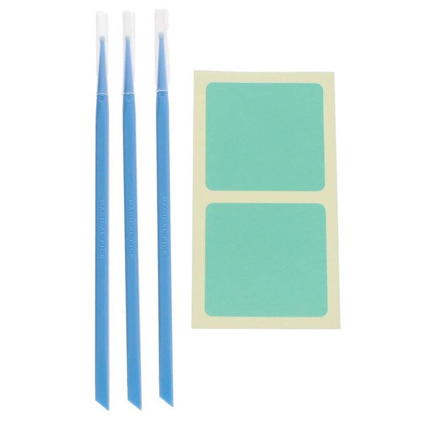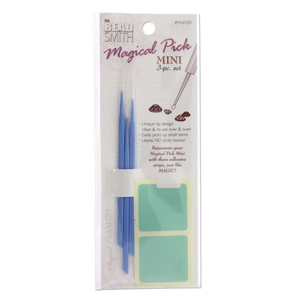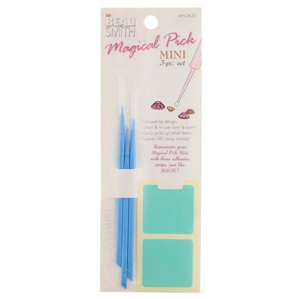 Now you can easily pick up small and difficult to handle items without fumbling with tweezers! The Beadsmith Magical Pick Mini 3 piece Set is ideal for working with rhinestones, seed beads, flat back stones, and other tiny jewelry components. You can even use it to clean dust from hard to reach places in beads and jewelry pieces. The specially designed resin tip on the tip of the Magical Pick is tacky, but not overly sticky so it won't leave a residue. Clean and re-use the pick over and over again! You can also use the angled end of the pick to strategically apply adhesive and/or adjust the position of placed items. Simply wipe the angled end to clean off adhesive before it dries. To use the Magical Pick remove the clear cover from the tacky resin tip of the pick. Touch the tip against the top of the items you want to move, then pick it up and put it into place. Replace the cover when finished to protect the resin tip. When the adhesive tip gets dirty or starts to lose its strength, use the included cleaning kit to rejuvenate the tip! To clean the pick, remove the blue cover to expose the adhesive surface of the tape, then tap or gently roll the soiled tip against the tape a few times. Replace the cover when finished. The cleaning kit should be able to restore the Magical Pick's adhesive strength...just like magic! The applicator tools can be used on many items: rhinestones, crystals, sequins, gems and other embellishments. Great for use with The Beadsmith Magical Tray. Use with diamond dotting and painting and to create beautiful nail art. These crafting accessories can be used by beginners and professionals.
