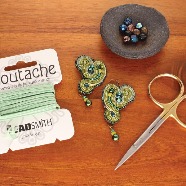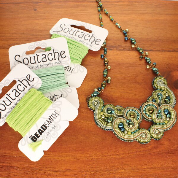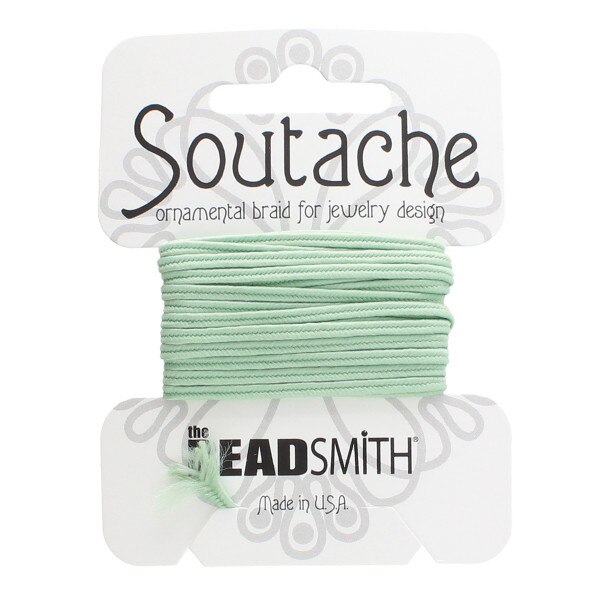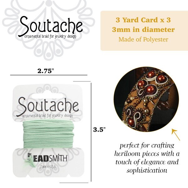 Our entire line of BeadSmith® Soutache was designed by a textile jewelry artist for textile jewelry artists with tremendous attention to consistency of width, thickness & drape so that rayon & polyester braid can be successfully combined. Polyester is an entirely synthetic fiber which takes color beautifully so the polyester braid is available in bright colors. The sheen of polyester is slightly duller than that of the rayon. Rayon is a semi-natural fiber—essentially re-processed cotton. Our rayon braid has more sheen and the colors are available in a more muted palette. Available in 3mm, retail-ready 3 yard card (bag of 3) or 144 yard spool