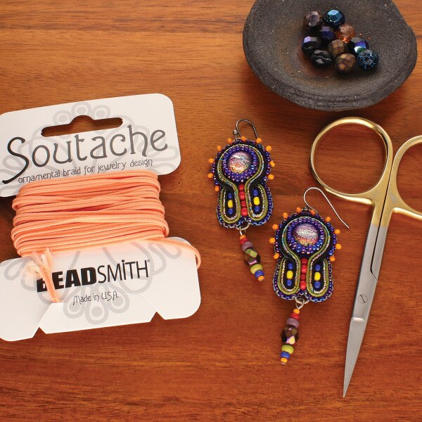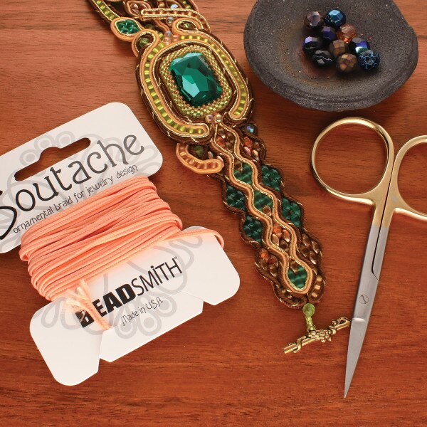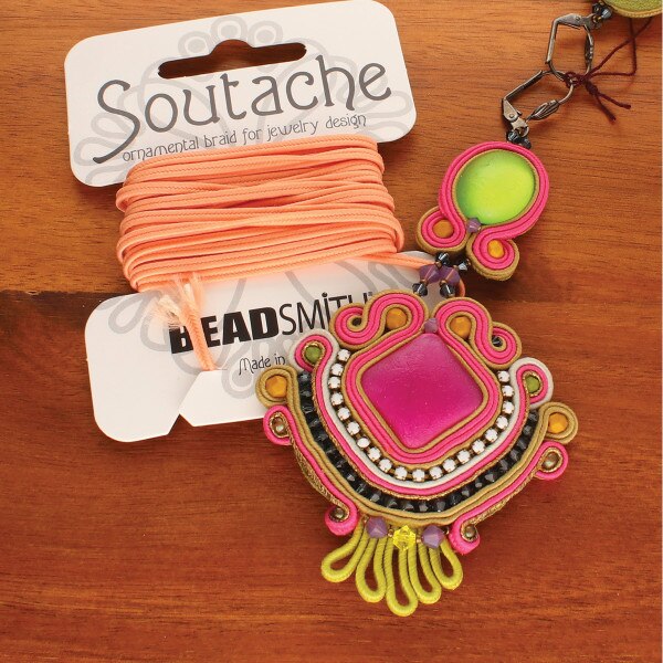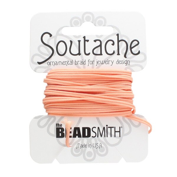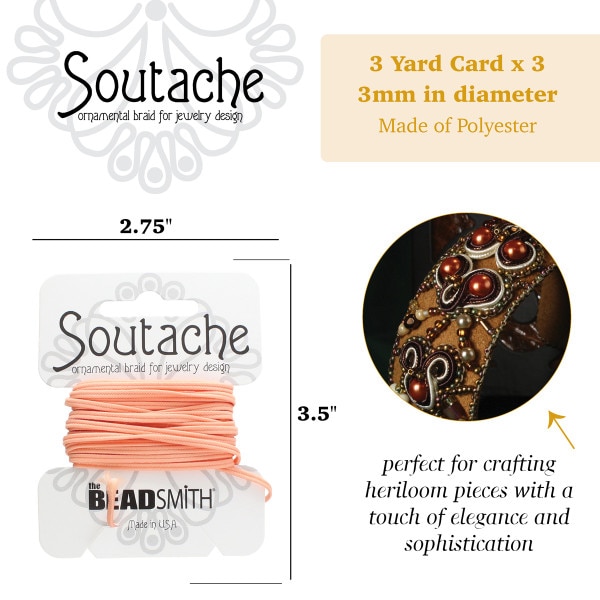 Our entire line of BeadSmith® Soutache was designed by a textile jewelry artist for textile jewelry artists with tremendous attention to consistency of width, thickness & drape so that rayon & polyester braid can be successfully combined. Polyester is an entirely synthetic fiber which takes color beautifully so the polyester braid is available in bright colors. The sheen of polyester is slightly duller than that of the rayon. Rayon is a semi-natural fiber—essentially re-processed cotton. Our rayon braid has more sheen and the colors are available in a more muted palette. Available in 3mm, retail-ready 3 yard card (bag of 3) or 144 yard spool