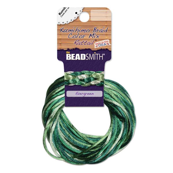 The Beadsmith Rattail cord is a versatile cord with many uses for lots of applications. The cord, often known as satin cord, nylon cord or rattail, is made of a cotton core and a rayon outside layer. The combination is a silky, shiny effect, which brings out the vivid colors. Our cord is made in the USA. The Beadsmith line of rattail is available in a variety of vibrant colors in 1mm, 2mm and 3mm sizes. There are 2 convenient sizes: 6 yard cards and 144 yard spools, as well as very popular color mixes. This color mix is a 1mm size in 4 different colored cords. Each string is a 3 yard length, total of 12 yards per mix. The rattail is soft and sturdy, while still easy to cut. This cord can be used to create tassels, scrapbook ribbon, drawstring bags, hair ornaments and braiding, trim for home décor and clothing, jewelry making, and so much more. Compatible with most jewelry findings and beads with large holes such as pony beads. Craft artists, hobbyists and jewelry makers are using this cord for many applications including Chinese knotting macramé, dream-catcher making jewelry making, kumihimo braiding and soutache crafting. More recently the satin feeling cord has been used for mask making. Don't hesitate to pick up this colorful mix and get started on the endless creative possibilities!