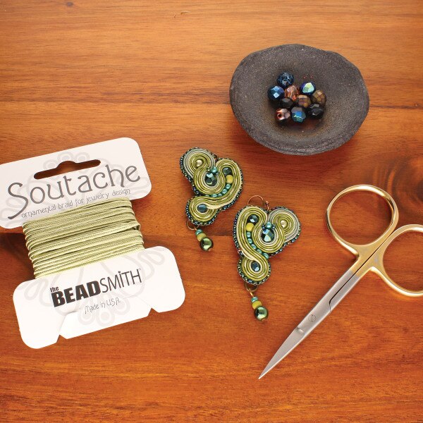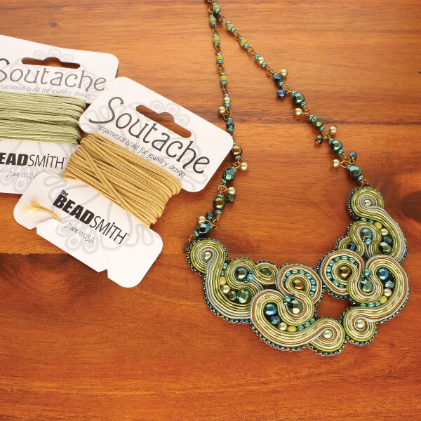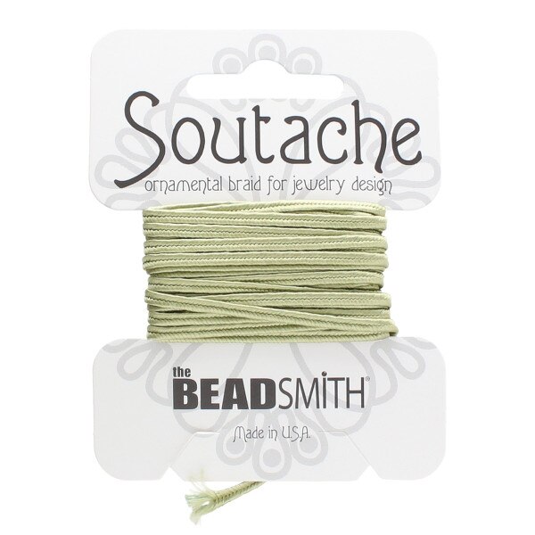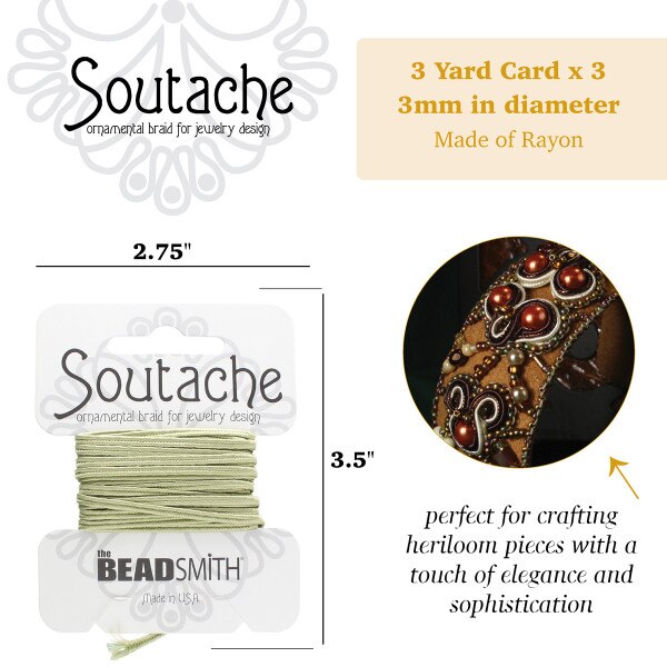 Our entire line of BeadSmith® Soutache was designed by a textile jewelry artist for textile jewelry artists with tremendous attention to consistency of width, thickness & drape so that rayon & polyester braid can be successfully combined. Polyester is an entirely synthetic fiber which takes color beautifully so the polyester braid is available in bright colors. The sheen of polyester is slightly duller than that of the rayon. Rayon is a semi-natural fiber—essentially re-processed cotton. Our rayon braid has more sheen and the colors are available in a more muted palette. Available in 3mm, retail-ready 3 yard card (bag of 3) or 144 yard spool