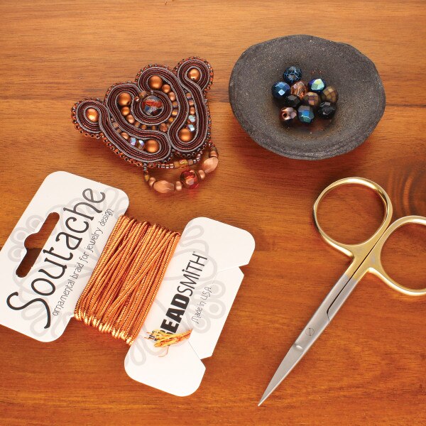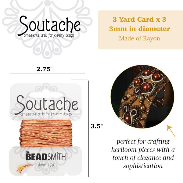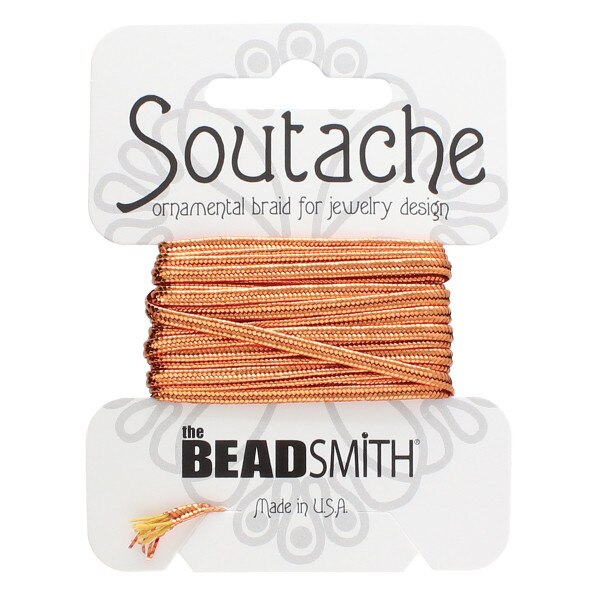 Our entire line of BeadSmith® Soutache was designed by a textile jewelry artist for textile jewelry artists with tremendous attention to consistency of width, thickness & drape so that rayon & polyester braid can be successfully combined. Polyester is an entirely synthetic fiber which takes color beautifully so the polyester braid is available in bright colors. The sheen of polyester is slightly duller than that of the rayon. Rayon is a semi-natural fiber—essentially re-processed cotton. Our rayon braid has more sheen and the colors are available in a more muted palette. Available in 3mm, retail-ready 3 yard card (bag of 3) or 144 yard spool