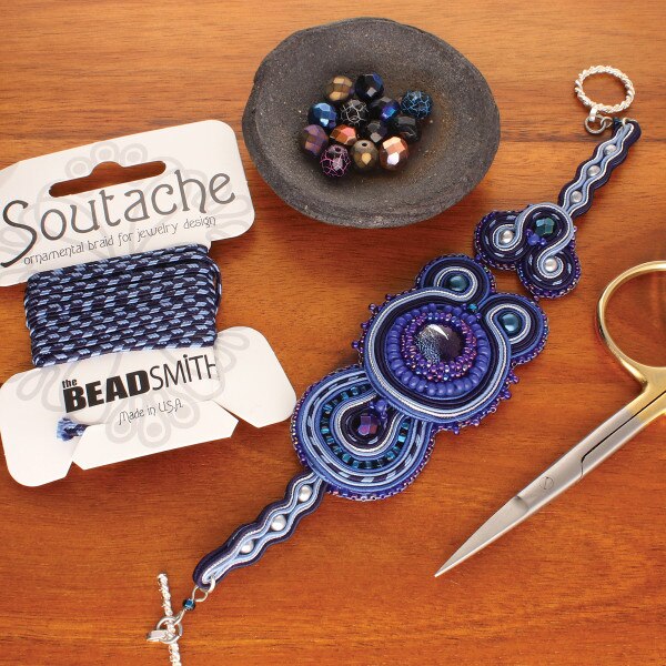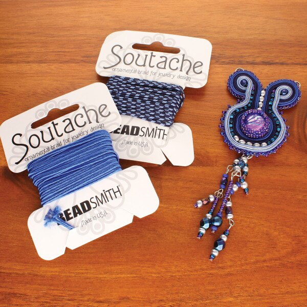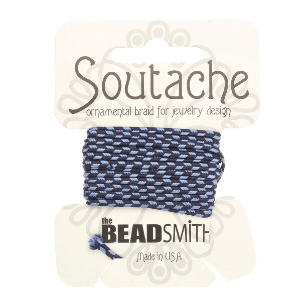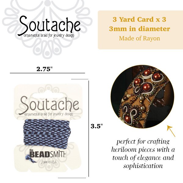 Our entire line of BeadSmith® Soutache was designed by a textile jewelry artist for textile jewelry artists with tremendous attention to consistency of width, thickness & drape so that rayon & polyester braid can be successfully combined. Polyester is an entirely synthetic fiber which takes color beautifully so the polyester braid is available in bright colors. The sheen of polyester is slightly duller than that of the rayon. Rayon is a semi-natural fiber—essentially re-processed cotton. Our rayon braid has more sheen and the colors are available in a more muted palette. Available in 3mm, retail-ready 3 yard card (bag of 3) or 144 yard spool