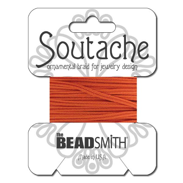 Our entire line of BeadSmith® Soutache was designed by a textile jewelry artist for textile jewelry artists with tremendous attention to consistency of width, thickness & drape so that rayon & polyester braid can be successfully combined. Polyester is an entirely synthetic fiber which takes color beautifully so the polyester braid is available in bright colors. The sheen of polyester is slightly duller than that of the rayon. Rayon is a semi-natural fiber—essentially re-processed cotton. Our rayon braid has more sheen and the colors are available in a more muted palette. Available in 3mm, retail-ready 3 yard card (bag of 3) or 144 yard spool