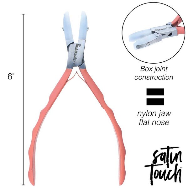 Designed to make jewelry repair, improvement, and creation easier, the Beadsmith Satin Touch double nylon Jaw flat nose pliers are an excellent addition to any jewelry making or jewelry repair kit. Made from high-quality polished steel, this tool is durable, heavy duty, and built to last. Because of their innovative design, these pliers enable you to straighten metal wire, sheet stock, or soft metals to create amazing jewelry pieces. With the nylon jaws, you won't have to worry about scratching or marring metal surfaces, and they can even be replaced over time. These pliers feature comfortable handles to improve your grip and boast a heavy-duty metal frame for longevity. With a compound box-joint construction, these pliers were designed to prevent hand fatigue and cramping when you clamp down, so you can create and repair many jewelry creations. Whether you're a professional jewelry artist or a hobby crafter, this plier tool makes a great addition to your art and craft supplies. Because these pliers are so versatile, they make a great gift for Christmas, a birthday, or any special occasion. Help your friends, family, and loved ones develop their creative and artistic talents with this straightening tool. It makes it easy to create beautiful pieces of jewelry! No matter what kind of wire you're using, these pliers are durable and built to last. Making DIY jewelry and fashion accessories has never been easier! You can create straight wires in no time. Your hobby should be fun and simple. Don't settle for old tools that break easily — this set of pliers is heavy duty, convenient, and easy to use.