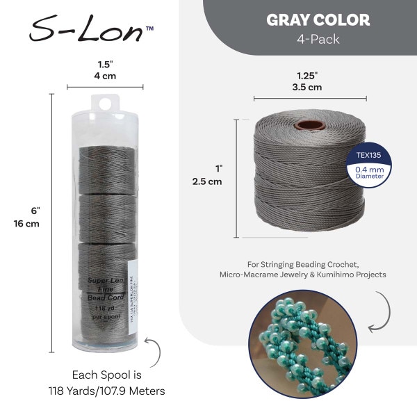 Whether you are stocking your supply room or ordering a set of bead cord for yourself, The Beadsmith’s S-Lon cord is up for the task. S-Lon cord is ideal for knotting gemstones or beads, kumihimo braiding, jewelry stringing and much more. S-Lon Bead cord is perfect for adults and kids alike to create jewelry from friendship bracelets to delicate pendants. It can fit through a variety of bead shapes and sizes, including glass, crystal, wood, and plastic beads. Bead cord is easy to string through beads and can be easily tied into knots. Plus, it is durable and flexible, which makes it extremely versatile when crafting. The bead cord can also be used to repair existing bracelets, necklaces, earrings, and other accessories. It can even be used for detailed crochet projects. Each spool of our S-Lon cord comes in a vibrant saturation of color and measures 77 yards. This tube contains 4 spools. With this beading cord, your homemade jewelry and crafts will retain a professional look for years to come. Knot and braid the cord to craft unique jewelry creations or to repair existing pieces. Unlock your creativity and manipulate this versatile cord to make jewelry pieces for your own collection or to add to someone else's jewelry accessories. Show someone how much you care by making a personalized statement necklace. Handmade beaded jewelry pieces make great gifts for friends or loved ones for birthdays, Christmas, weddings, graduation, or other special occasions. Add this jewelry cord assortment to your crafting or beading supplies today and unlock your artistic talents.
