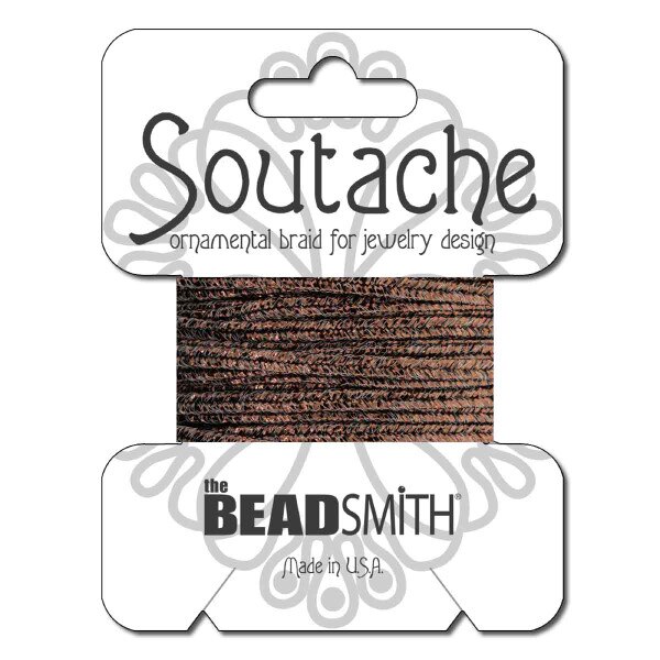Our entire line of BeadSmith® Soutache was designed by a textile jewelry artist for textile jewelry artists with tremendous attention to consistency of width, thickness & drape so that rayon & polyester braid can be successfully combined. Polyester is an entirely synthetic fiber which takes color beautifully so the polyester braid is available in bright colors. The sheen of polyester is slightly duller than that of the rayon. Rayon is a semi-natural fiber—essentially re-processed cotton. Our rayon braid has more sheen and the colors are available in a more muted palette. Available in 3mm, retail-ready 3 yard card (bag of 3) or 144 yard spool